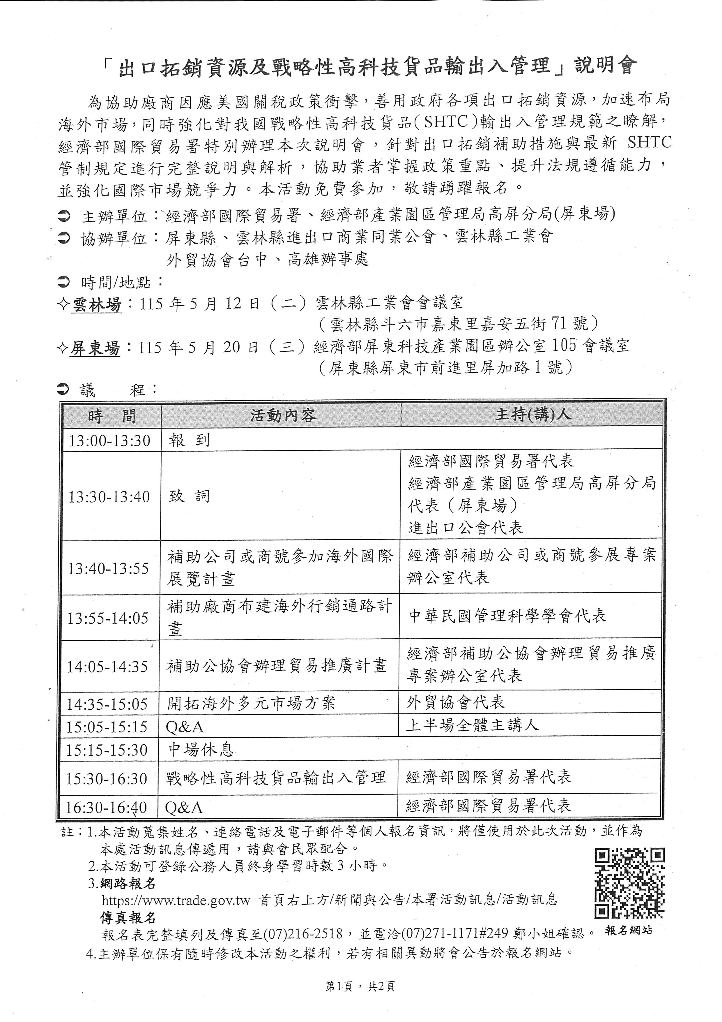 經濟部國際貿易署 為協助廠商因應美國關稅政策衝擊, 善用政府各項出口拓銷資源, 加速布局海外市場, 同時強化對我國戰略性高科技貨品輸出入管理規範之瞭解 於115年5月12日及20日 分別於雲林及屏東辦理 出口拓銷資源及戰略性高科技貨品輸出入管理 說明會